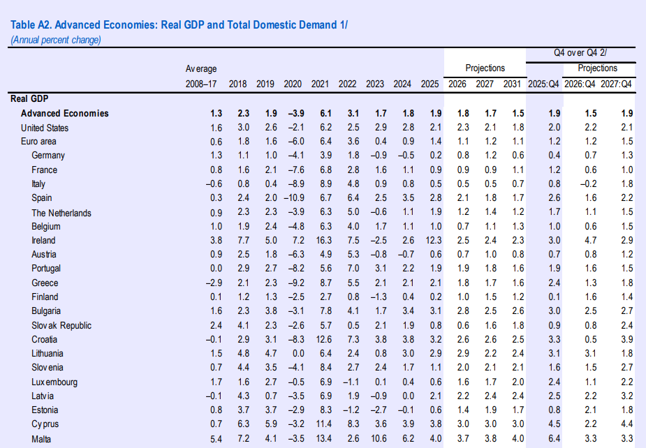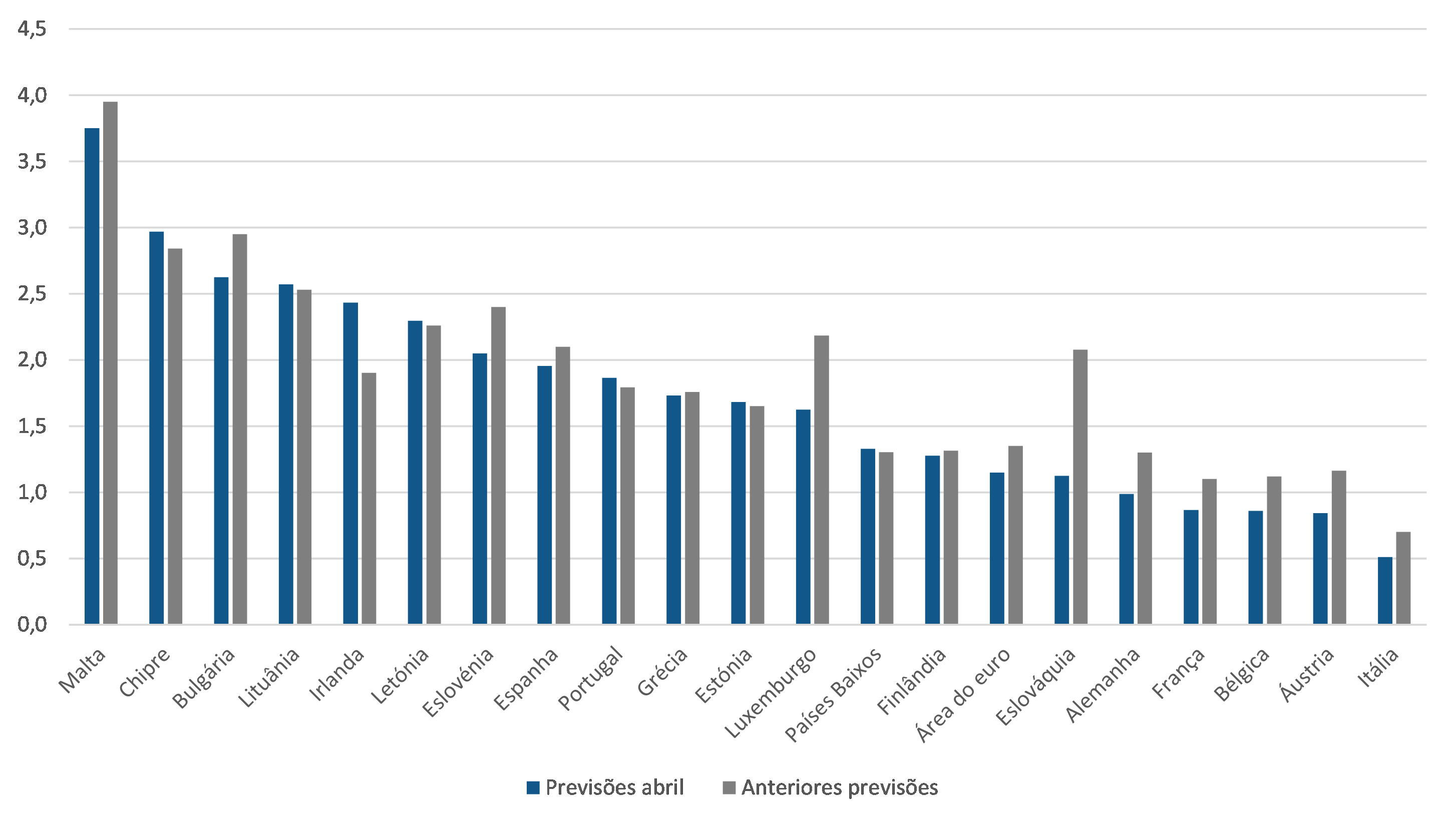 O cenário de referência da instituição assume que o conflito é de curta duração, mas implica um menor crescimento na área do euro de 1,1% em 2026 (menos 2 décimas face às previsões de janeiro), acelerando ligeiramente em 2027 para 1,2%,. Os efeitos negativos da guerra juntam-se a outros fatores adversos ligados à invasão da Ucrânia pela Rússia como o persistente aumento dos preços da energia que afeta o setor industrial, o qual enfrenta pressões adicionais da apreciação real do euro. No caso de Portugal, ainda que o crescimento de 2026 tenha sido revisto em baixa (igualmente em duas décimas) face às previsões de outubro para 1,9% no ano de 2026, o crescimento de 2027 foi revisto em alta em 0,3 p.p., para 1,8%, continuando assim a tendência de crescimento acima da área do euro.