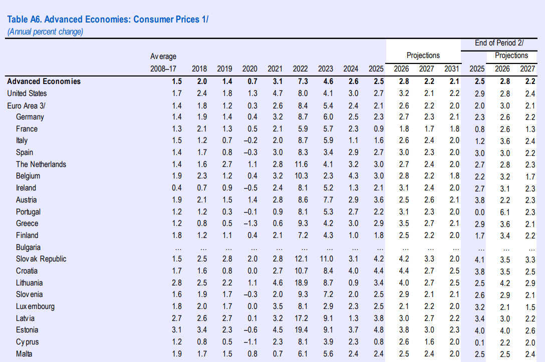 No que respeita à inflação, deverá observar-se uma pausa no processo desinflacionista, com pressões provenientes dos preços da energia e dos bens alimentares. Assim, no caso da área do euro, os valores foram revistos em alta em 0,7 p.p. no ano de 2026 para 2,6% e em 0,2 p.p. no ano de 2027 para 2,2%. Entre os países da moeda única, espera-se que a inflação média nestes dois anos seja mais elevada na Eslováquia (3,8%) e menor no caso da França (1,8%). No caso de Portugal, a inflação foi revista em alta em 1 p.p. para 3,1% no ano de 2026, e em 0,1 p.p. para 2,2% no ano de 2027.